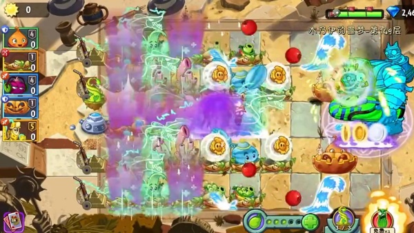 3、你不断种植更多的植物来增强他们的战斗力,并消灭所有入侵的僵尸。