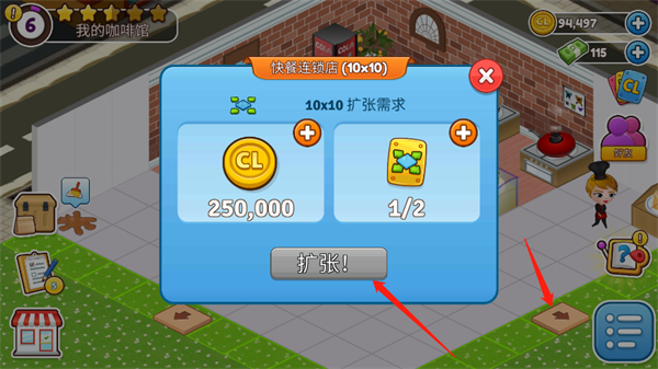 4、当你觉得餐厅空间不足时,点击箭头进行扩建,但需要先满足扩建条件。