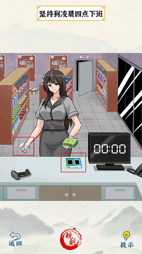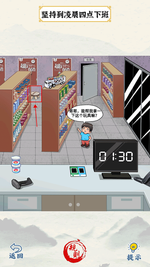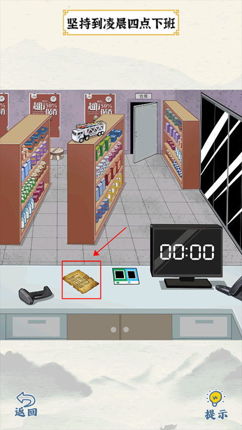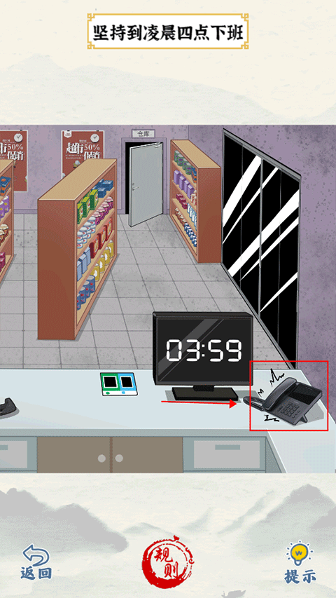 7、电话铃声响起时:点击电话,然后拖动货架上的商品,找到螺丝刀,将螺丝刀拖到显示器上,将时间调整为凌晨四点,最后点击门即可顺利通关。