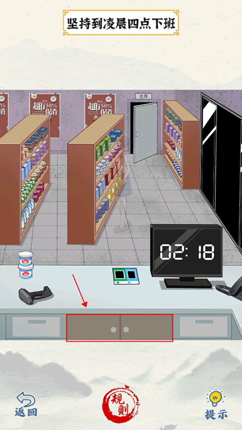 4、人影出现时:点击柜台下方的柜门躲起来,等男人离开后,再点击“离开”继续游戏。