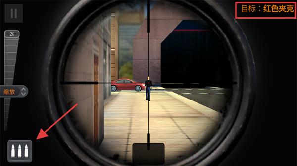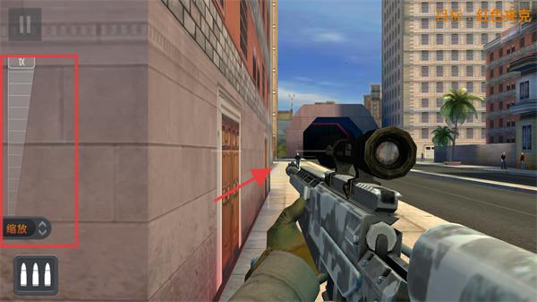 2、进入关卡后,利用左侧的【缩放】功能调整狙击镜的视角,将镜头对准目标区域附近的门口。