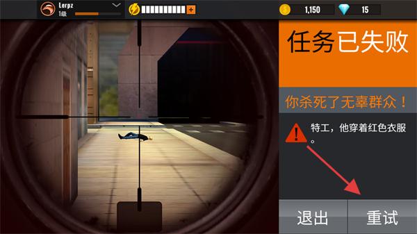 4、如果误伤无辜导致【任务失败】,可以点击【重试】按钮重新开始关卡,注意精准识别目标再进行射击。