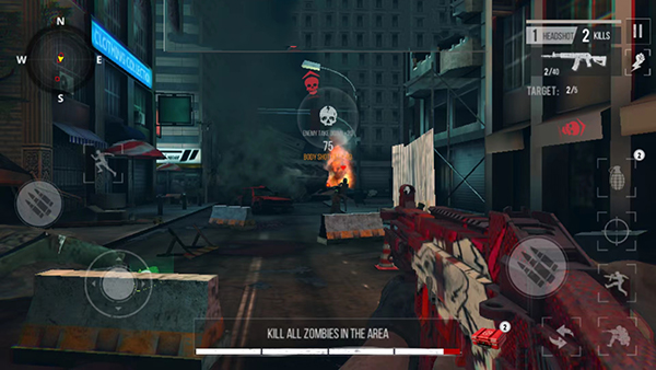 6、进入战斗界面时,会听到僵尸的叫声,要时刻注意周围环境,通过射击或者投掷手雷来消灭所有僵尸。
