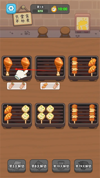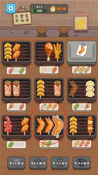 3、合理安排鸡腿的组合,使三个相同的鸡腿同时烤熟后消除。每轮都有时间限制,随着游戏进行,难度会逐渐增加,需要更快更精准地操作。