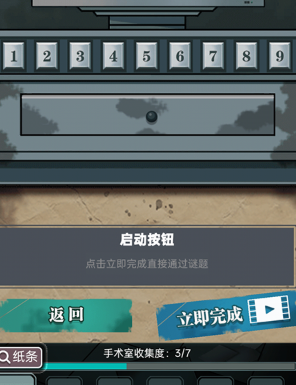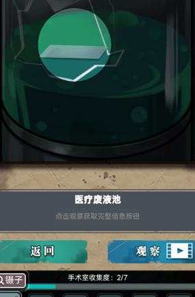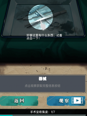 3、下面的进度条显示手术室共有7个谜题,谜题环环相扣,在这里,点击器械获取道具。
