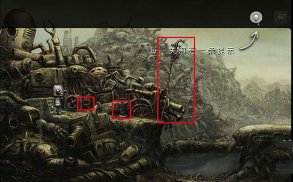 1、打开机械迷城,你会看到一些介绍,点击图中红色标记的位置,机器人的主体就会出现在上面的方框下面,机器人的头部在左下角,它们将组合成一个机器人。