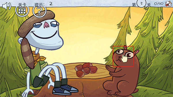 3、第三关:点击小松鼠让它吃榛子,然后点击角色让他也吃榛子,最后,让角色吃掉两个榛子来通关。