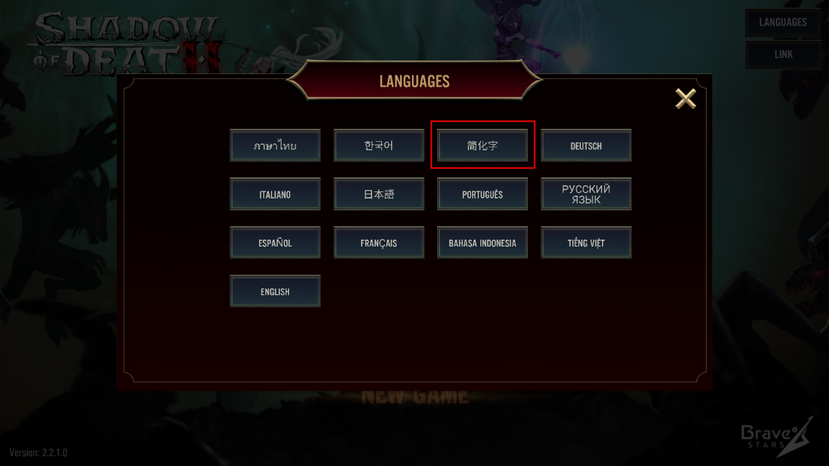 1、下载并打开死亡阴影2游戏后,点击右上角的语言设置,选择“简体中文”就可以把界面切换成中文,非常方便。