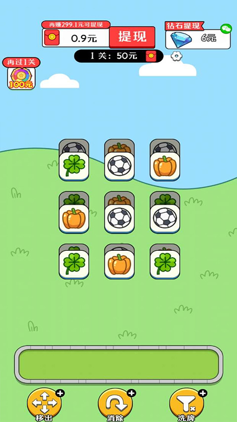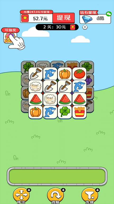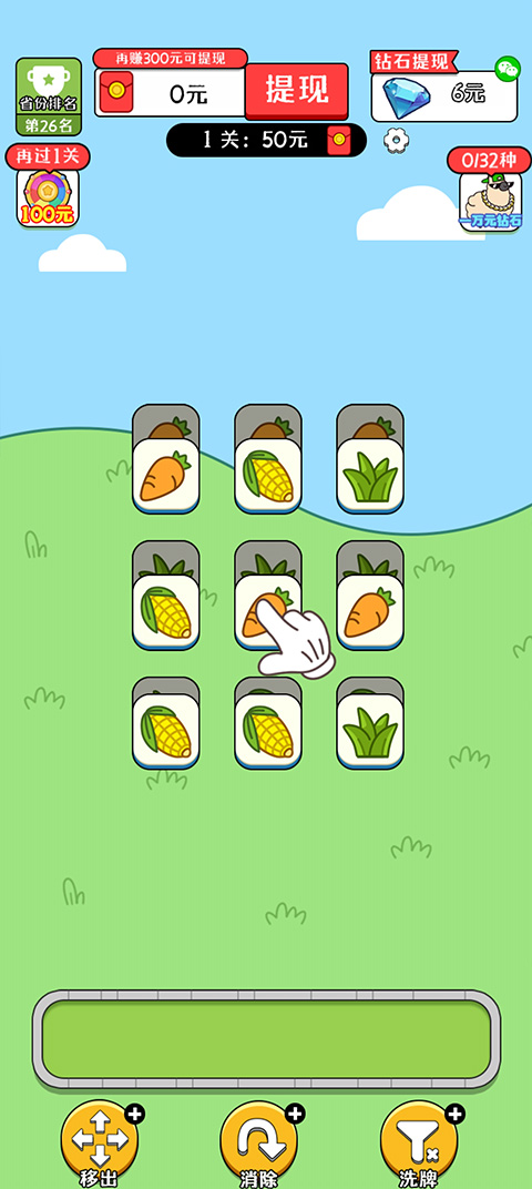 3、进入第二关,玩法依然是将三种相同图案的蔬菜进行配对消除,每成功通过一关,系统会奖励一只羊,积攒的羊越多,最终提现额度就越高;