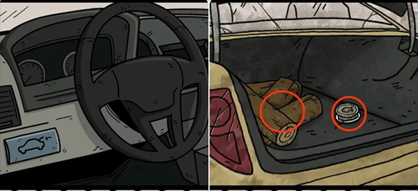 4、到后院拿走树根旁的铁铲,然后前往车库,用铁铲打开架子上的颜料罐,里面可以拿到钥匙。