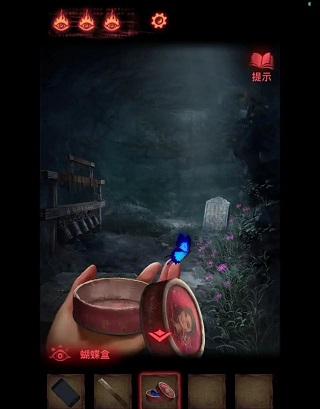 17、回大门处,使用【胭脂盒】点击蓝色区域,获得【蝴蝶盒】。带着【蝴蝶盒】回花园,放飞蝴蝶,蝴蝶会停在花朵上,用【锋利铜尺】取下,获得【冥陀兰】。