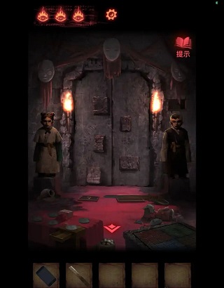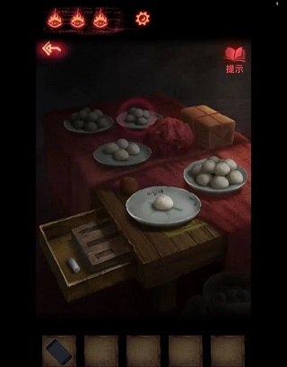 2、点击下方箭头,再点击右侧箭头,来到本章第三个场景——忌物阁。点击中央墙面,完成转方格小游戏,获得墙面线索(8王4鬼5口1木8虫)。回到大门处,点击左侧磁盘,按照墙面线索顺序放入糖瓜(8王4鬼5口1木8虫),打开抽屉获得【蜡烛】和【石板】。