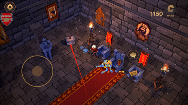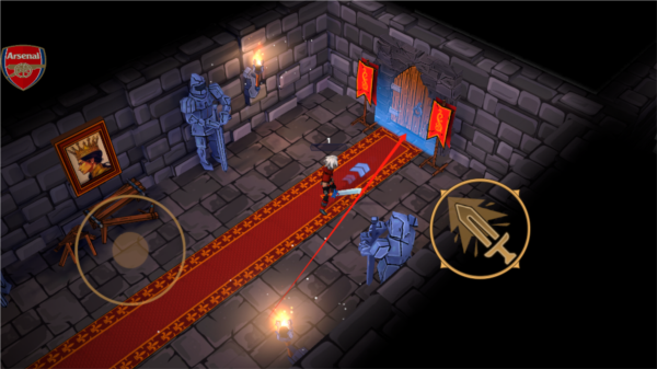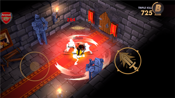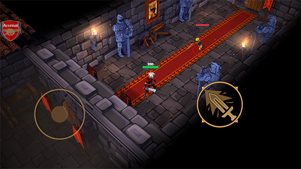 1、进入游戏后就会开始战斗,左侧的虚拟轮盘用于控制角色走位,灵活移动躲避敌人攻击,右侧轮盘则用于攻击,按住右侧轮盘可以进行冲锋,对敌人造成更多伤害。