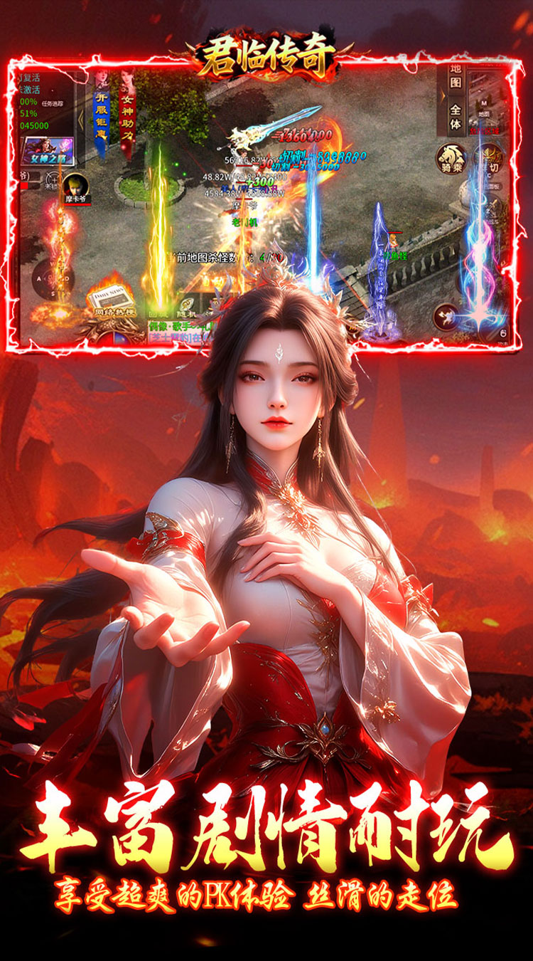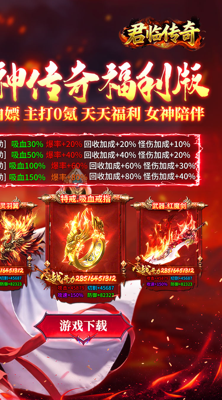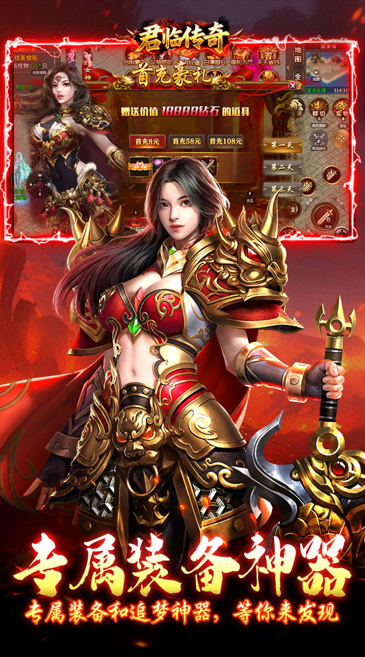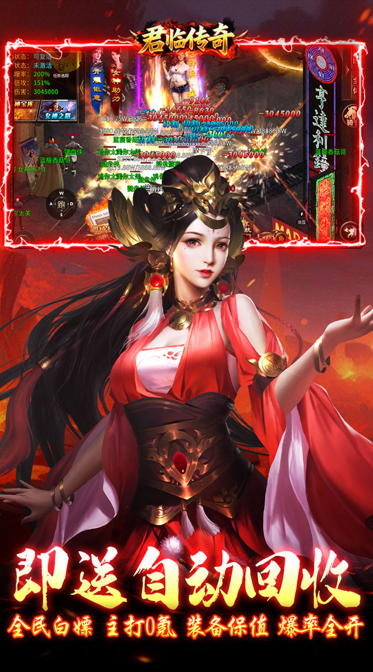 1、君临传奇女神传奇福利版创角即送自动回收,自动拾取,每日赠送648红包。