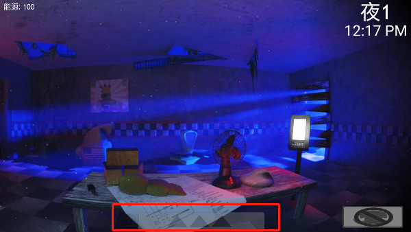 3、进入摄像头视角后,点击右下角的蓝色方块来切换监控范围。当发现面包熊出现时,需要屏住唿吸,仔细观察它的位置,然后再次点击下方三角形,将视线切回房间。