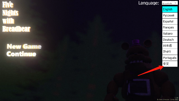1、首先在本站下载安装面包熊的午夜后宫游戏,打开后点击右上角的language下拉菜单选择中文,并将字体设置为中文模式,然后点击New Game开始新的游戏。