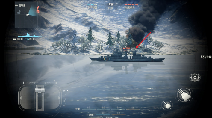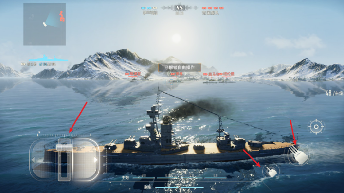 5、完成空中轰炸阶段后,玩家将切换为操控战舰作战,操作方式基本一致,左侧控制航向,右侧用于主炮与副炮射击。