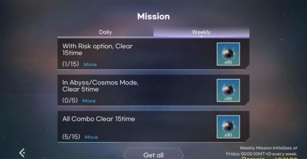 2、对于每日和每周任务,单击菱形以折叠或展开,展开任务后,再次单击任务界面,可查看任务的详细信息,如果找不到地方,可以点击蓝色的“move”直接跳转,似乎日常任务可以播放未购买的歌曲,任务完成后,它们将被重新锁定。