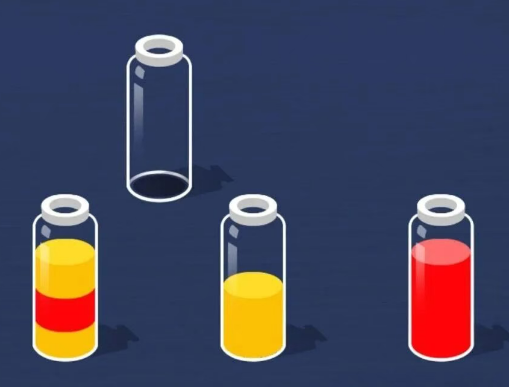 2、例如,在第一关中,首先点击有三层水的瓶子,最上面的一层是黄色的。