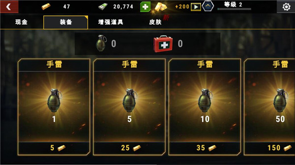 7、你也可以购买各种装备,如手榴弹和生命包,还有不同的皮肤可以解锁并在游戏中使用。