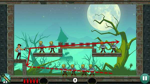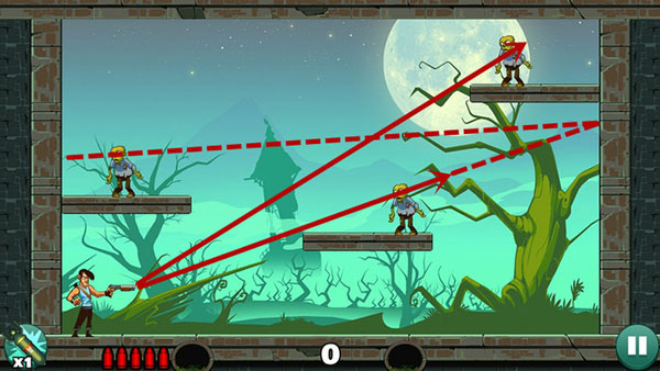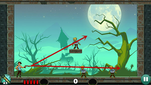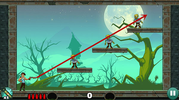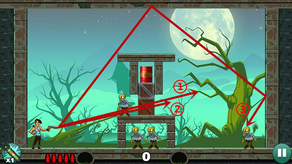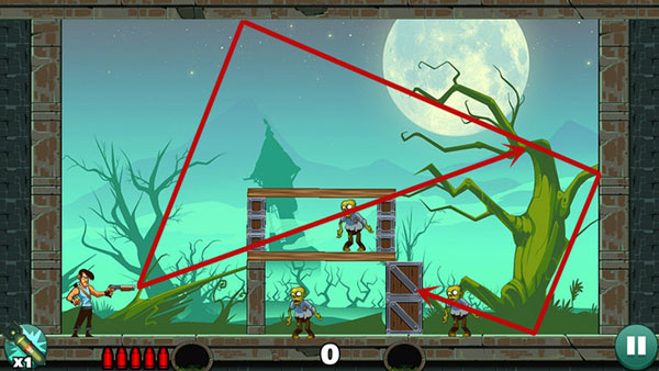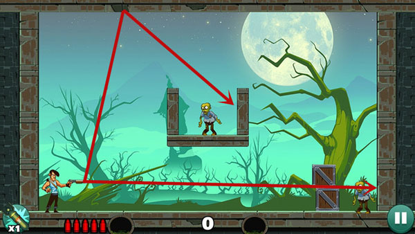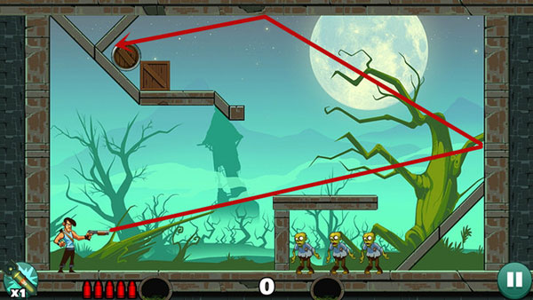 第一关:这一关最容易通过,没必要耍什么花招,对准僵尸开枪就行了,如果你想用一颗子弹通过,你不妨尝试不同的角度。