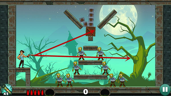 第十关:这个关卡相对简单,可以用一颗子弹射击上面的僵尸,然后用反弹的子弹杀死右边的僵尸,最后一个会被木箱直接压死,你也可以敲掉木板,用这种方法从上面弹开。