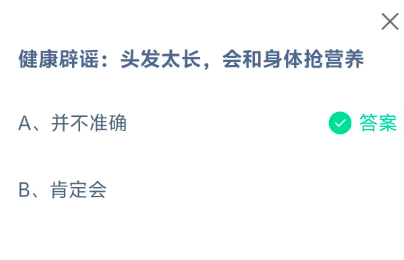 健康辟谣:头发太长,会和身体抢营养?这是今天《支付宝》每日一题的问题,相信我们很多用户都很想知道这个问题的答案是什么?这么一个可以领取饲料的机会相信我们很多用户都不想错过,这里指玩手游网的小编为你带来了2025《支付宝》11月6日每日一题最新答案介绍(2)的全部内容,喜欢的小伙伴欢迎点击进入看看吧。