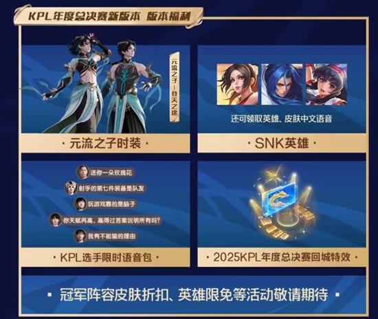以上就是指玩手游网小编为你带来的《王者荣耀》2025KPL年度总决赛时间介绍的全部内容,更多精彩游戏资讯攻略尽在指玩手游网,感兴趣的小伙伴欢迎点击关注收藏本网站哦。
