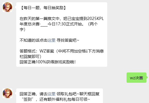 今日问题:在昨天的第一篇推文中,妲己宝宝提到2025KPL年度总决赛·____今日17:30正式开始。(两个字)
