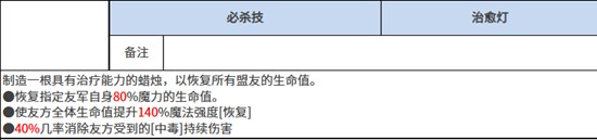 效果:召唤发光蜡烛,为全体队友恢复生命值,恢复量基于友军魔力值,最高可按80%魔力值转化为生命回复。