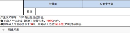 初始效果:单体攻击,可激活燃烧状态造成额外伤害并刷新持续时间。