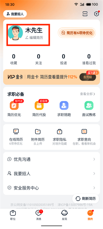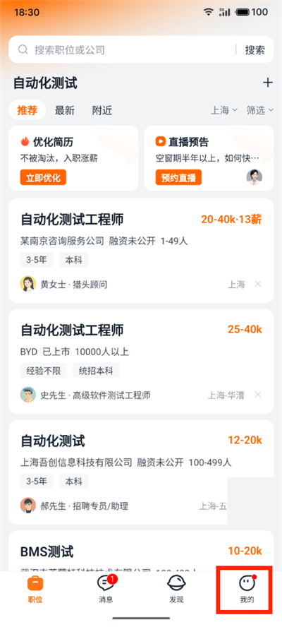 1、打开猎聘 APP,点击右下角的【我的】,进入个人空间。