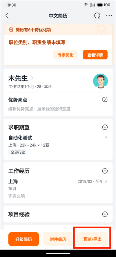 3、进入简历编辑界面后,找到右下角的【预览/导出】并点击。
