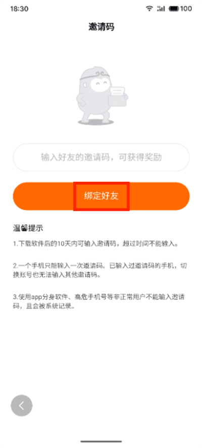 4、在弹出的输入框中输入好友邀请码,点击【绑定好友】即可领取金币。