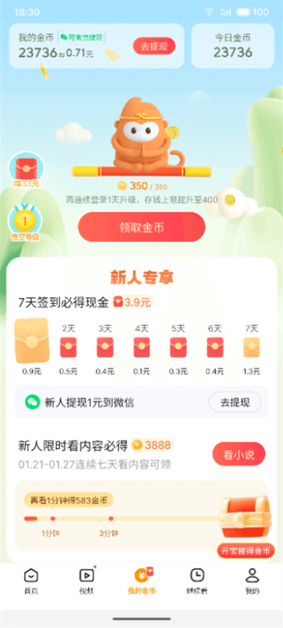 2、在金币页面向下滑动,了解更多金币获取方式。