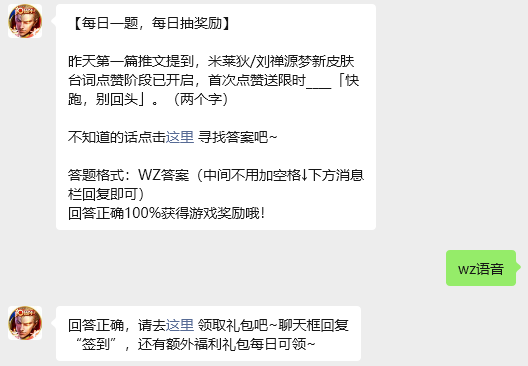 今日问题:昨天第一篇推文提到,米莱狄/刘禅源梦新皮肤台词点赞阶段已开启,首次点赞送限时____「快跑,别回头」。(两个字)