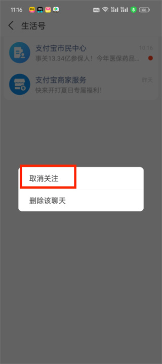 3、进入生活号列表后,找到要取消的订阅,长按该订阅并在弹出的对话框中点击【取消关注】即可。