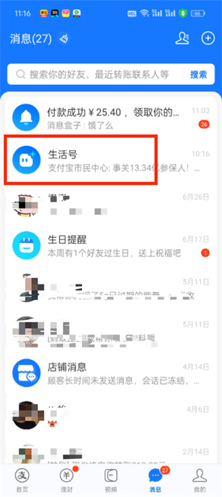 2、在消息页面中选择【生活号】;