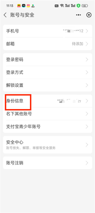 4、在账号与安全页面点击【身份信息】;