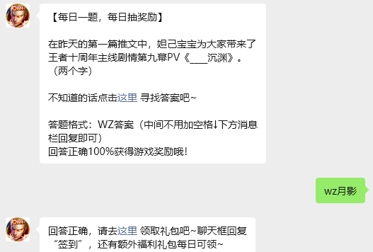 今日问题:在昨天的第一篇推文中,妲己宝宝为大家带来了王者十周年主线剧情第九幕PV《____沉渊》。(两个字)