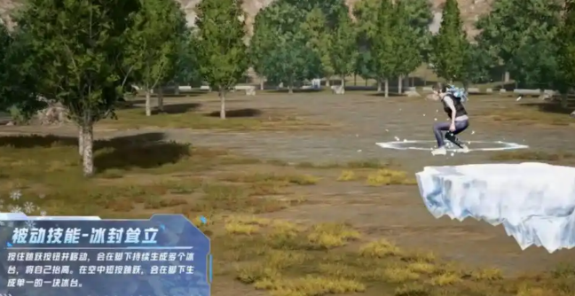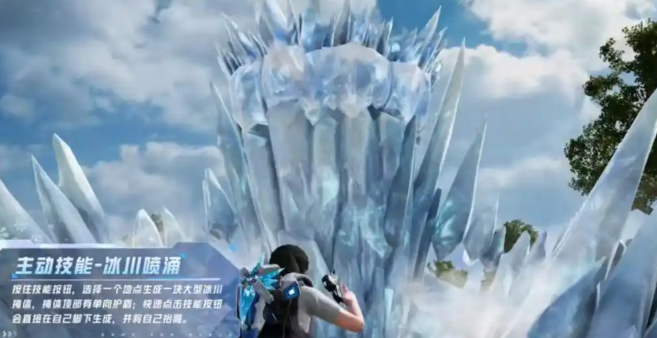 按住技能按钮可选择一片区域生成大型冰川撞体,顶部带有单向护盾;快速点击技能按钮则在自己脚下生成冰川撞体并站立于其上,提供防御和控制区域。