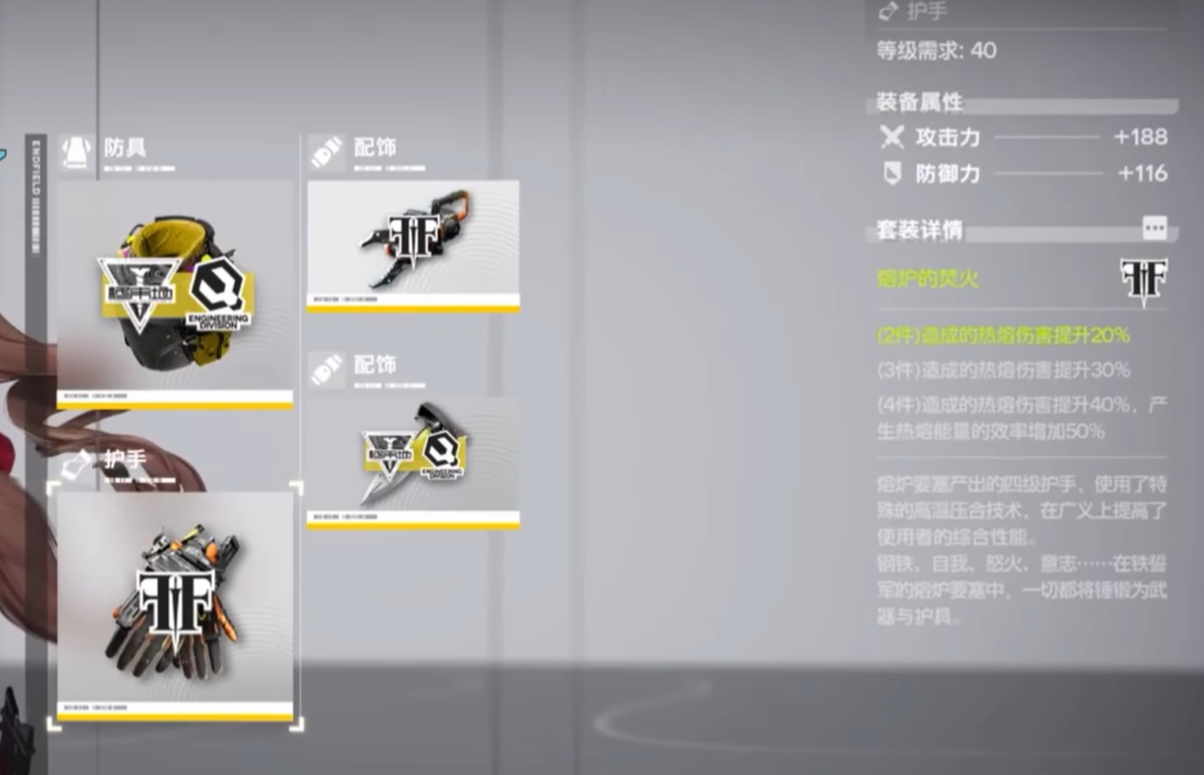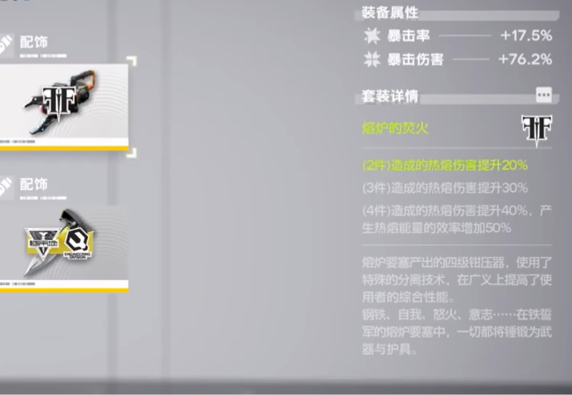 熔炉套装以提升热熔伤害与技能频率为核心,适合热熔输出角色,尤其适合安洁莉娜打造爆发输出流阵容。