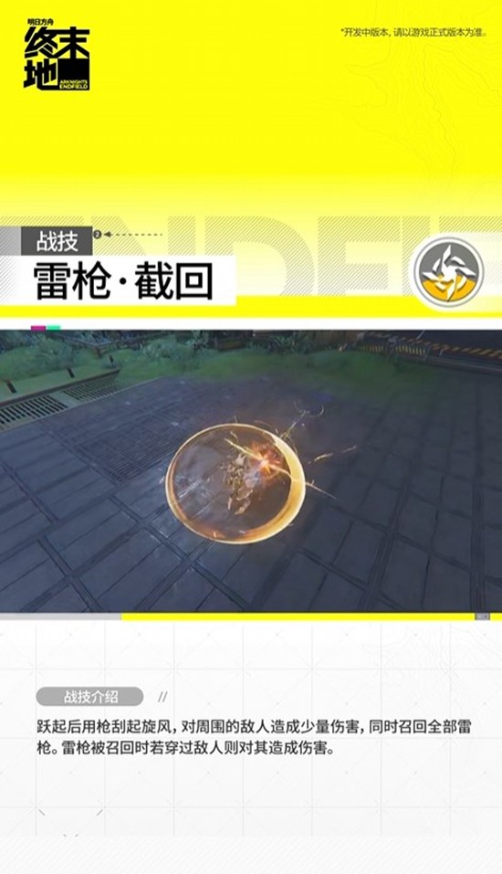 主控干员对处于电磁附着或导电状态的敌人造成重击时可触发。跃起向目标掷出三支雷枪,对前方范围内敌人造成伤害。