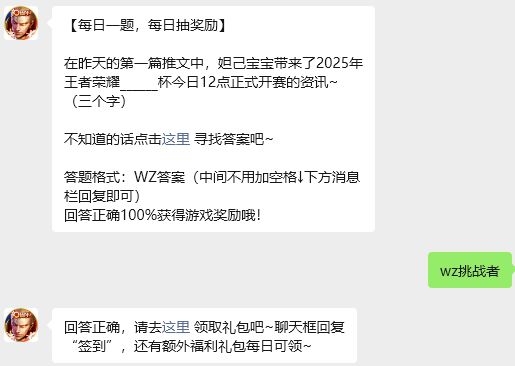 今日问题:在昨天的第一篇推文中,妲己宝宝带来了2025年王者荣耀______杯今日12点正式开赛的资讯~(三个字)