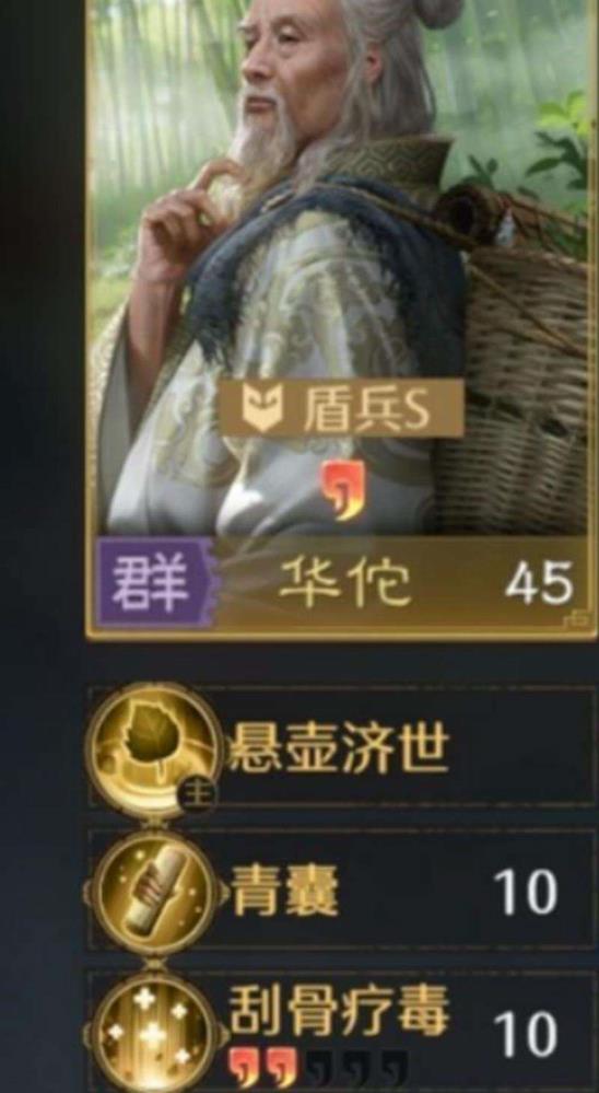 华佗:刮骨疗毒群体治疗,仁治武功与资军后勤增强战斗力,虎贲军和坚阵合一提升防御。