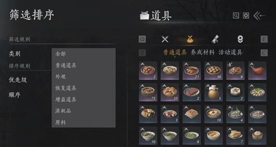 普通道具新增「增益道具」与「恢复食物」分类,日常找物更加方便。例如「清河八大碗」等道具可丢弃,节省背包空间,管理更灵活。