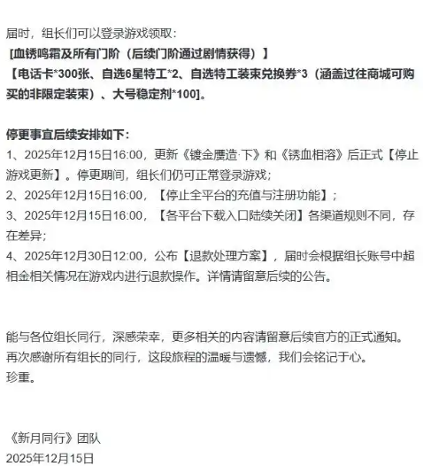 2025 年 12 月 15 日 16:00:更新《镀金赝造・下》和《锈血相溶》,正式 停止游戏更新,组长仍可登录。