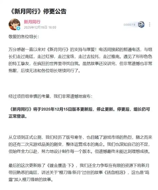 以上就是指玩手游网小编为你带来的二次元横版回合制策略游戏《新月同行》宣布停更的全部内容,更多精彩游戏资讯攻略尽在指玩手游网,感兴趣的小伙伴欢迎点击关注收藏本网站哦。