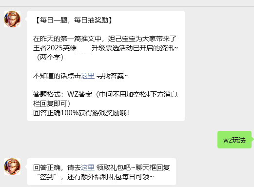 今日问题:在昨天的第一篇推文中,妲己宝宝为大家带来了王者2025英雄_____升级票选活动已开启的资讯~(两个字)
