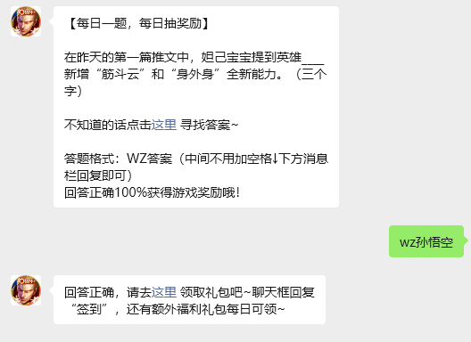 今日问题:在昨天的第一篇推文中,妲己宝宝提到英雄____新增“筋斗云”和“身外身”全新能力。(三个字)